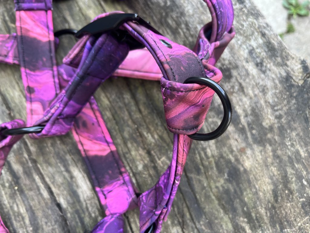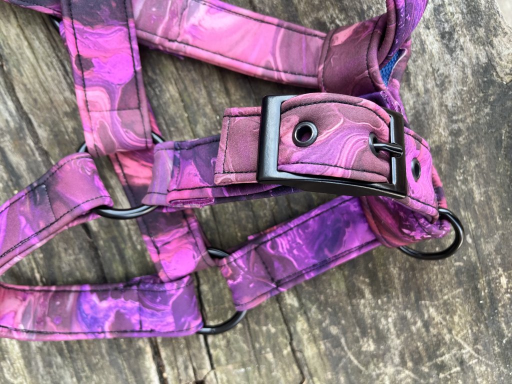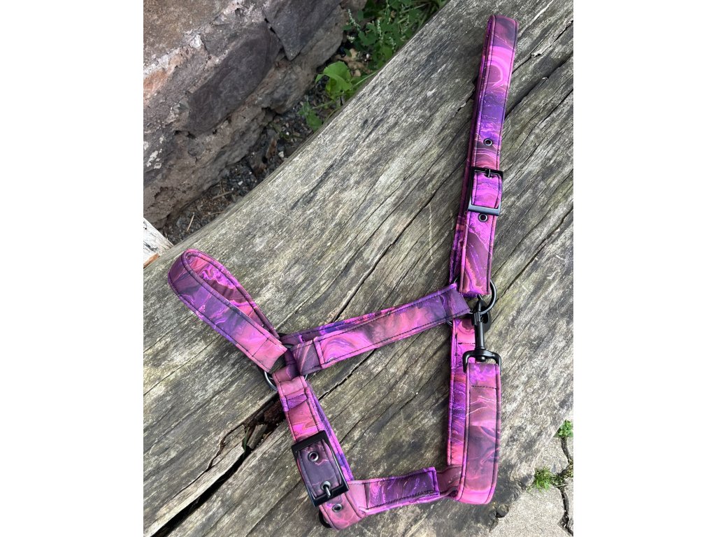 Ručně šitá ohlávka, popruh je obešitý softhellem, doplněné černými kovovými komponenty.